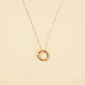 A close-up of a model wearing a chic two-tone necklace from Zewory Jewellery. The delicate silver chain is complemented by an organic, irregular-shaped rose gold circle pendant, creating a modern mixed-metal look against her skin.